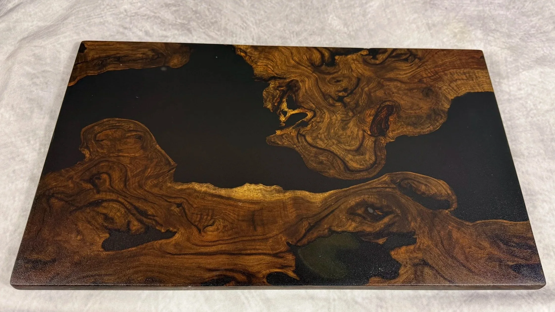 Walnut burl board with black epoxy showing how epoxy stabilizes natural defects in wood
