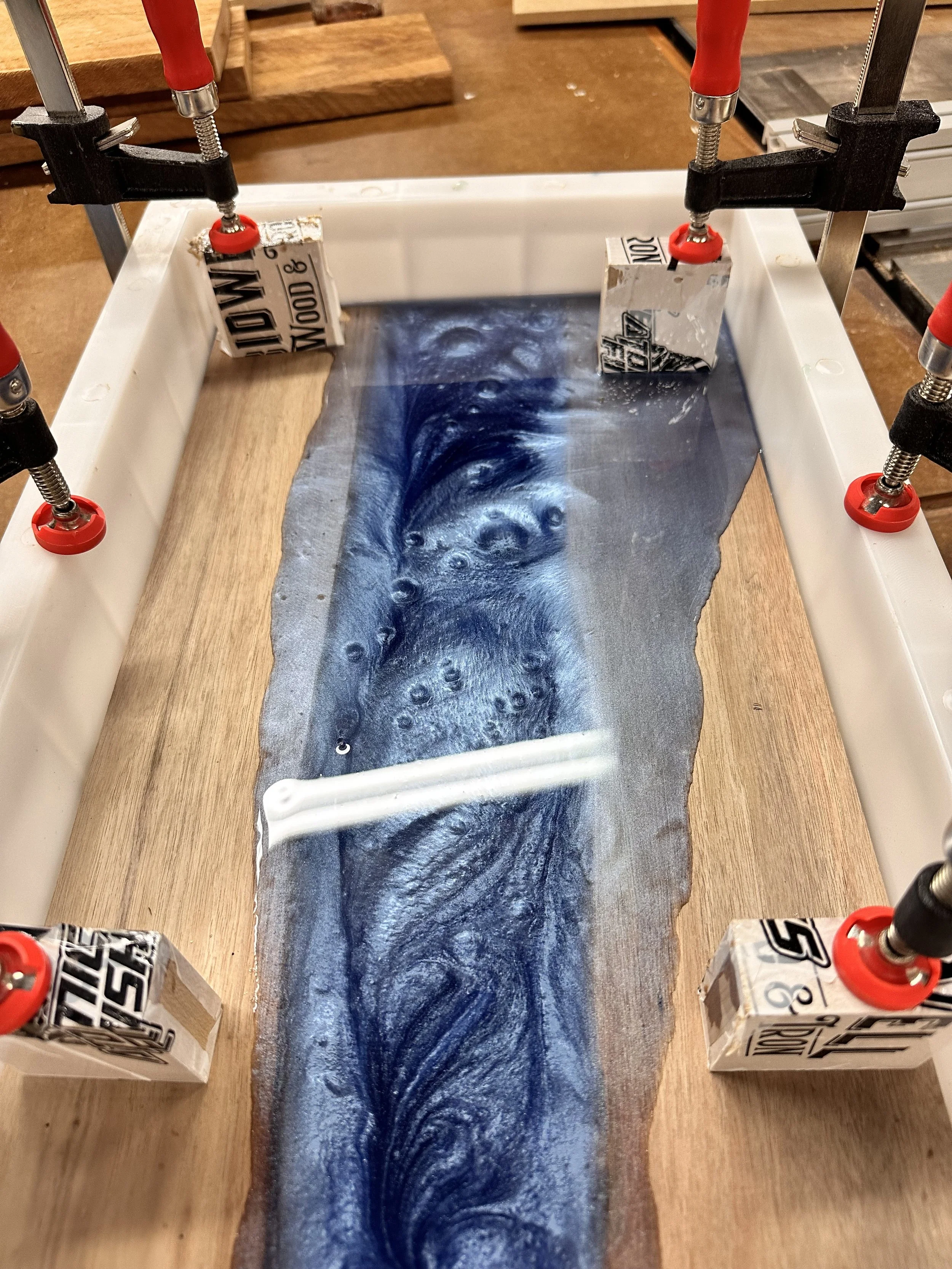 Blue epoxy resin being poured into a river board mold in the wood shop