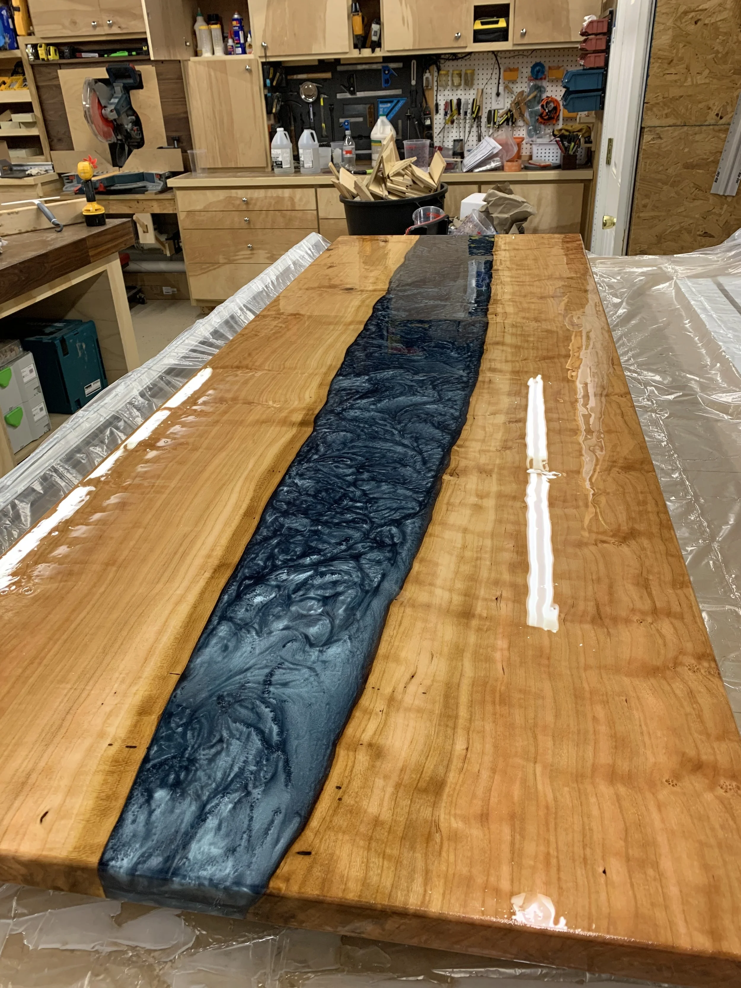 Deep blue metallic epoxy resin cherry coffee table in the wood shop